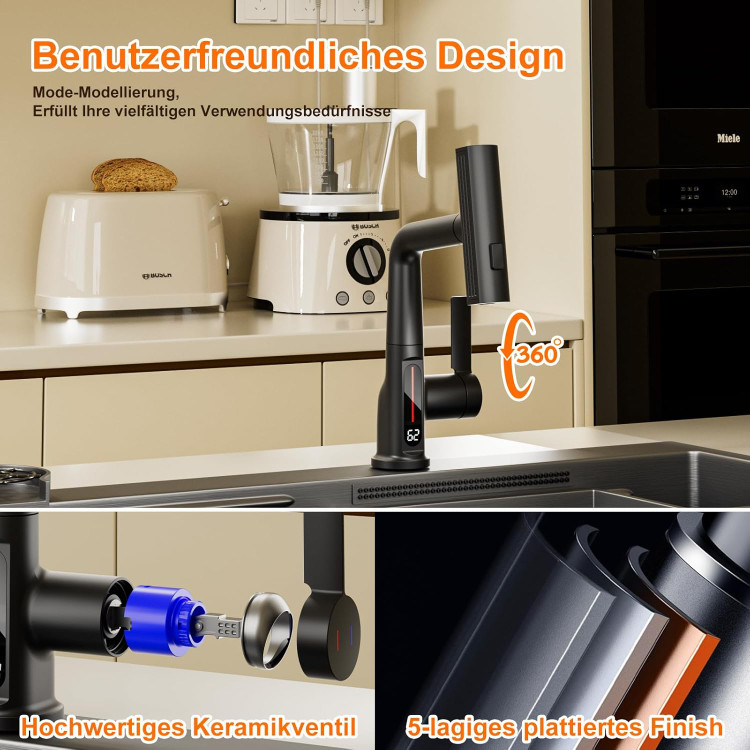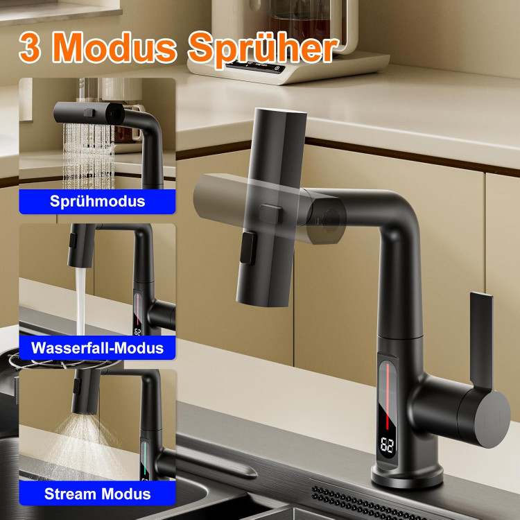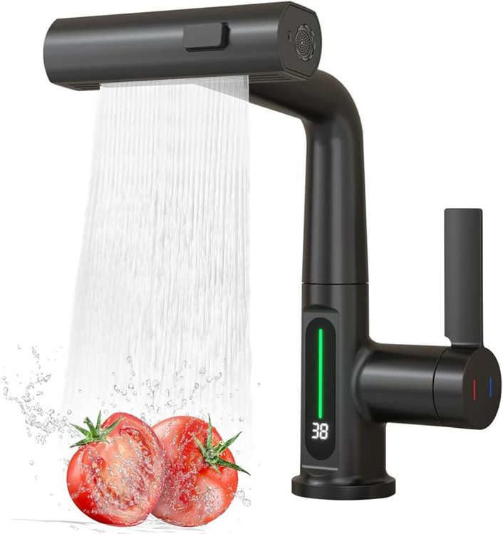 دمای آب رو بهت میگه، چهار مدل پاشش آب داره که اگه ازش درست استفاده کنی، کف سینک رو مثل طلاسازی برق میندازه. شلنگ کشویی داره که باهاش میتونی حتی آب رو بریزی رو استیکهایی که تو یخچال ته کشیدن!